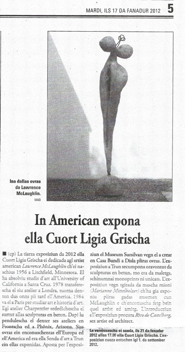 Lawrence McLaughlin ist 1956 in Litchfield Minnesota geboren. Studien an der University of California, Santa Cruz. 1978 verlegt er sein Atelier für zwei Jahre nach London. 1984 studiert er an der Ecole Nationale Supérieure des Beaux Arts in Paris Kunst und Kunstgeschichte. Im Atelier Charpentier widmet er sich dem Schaffen von Betonskulpturen und Monoprints. Seither pendelt er zwischen seinen Ateliers in Frankreich und Phoenix, Arizona. Seine Werke sind in Europa und in Amerika bekannt. Auch am Kunstpfad am Rhein in Trun findet man seine Werke. Für die Ausstellung im Museum Sursilvan wird er im Bundihaus in Disla einige Werke kreieren.