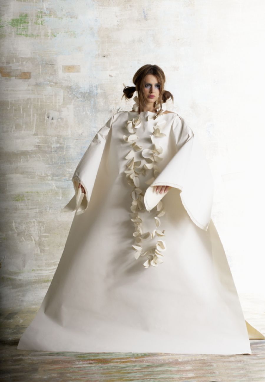 Mascha Mioni ist in diesem Ensemble die Vertreterin der «Art to Wear» und stellt die Verbindung her zwischen den frühen Arbeiten von Elsi Giauque, als diese Wortschöpfung noch nicht erfunden war. Zu Beginn hat sie feinste Seide gefärbt, bemalt und in akribischer Kleinarbeit von Hand plissiert, um sie anschliessend um den Körper zu drapieren. Ein solches «Kleid» konnte sowohl Körperhülle als auch Wandobjekt sein. In ihren neueren Arbeiten trieb sie die Idee auf die Spitze, das Bild von der Wand zu holen und um den Körper zu drapieren, indem sie eine leere weisse Leinwand mit wenigen Kniffen zum Kleid drapierte. Die Metamorphose Bild - Kleid - Objekt wurde vollzogen. Mit der Installation «Hüllen des Menschseins» wird die Beziehung zwischen Körper und Geist thematisiert. Die Hauptfigur ist umgeben von sogenannten Wortbildern, tagebuchartigen Satzskeletten, welche als eigenständige Gedankenhüllen lesbar sind.