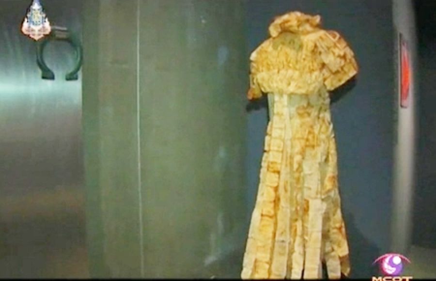 Zum Beispiel wurde die delikate Arbeit der Schweizer Künstlerin Mascha Mioni sehr schön erschaffen und ausgestellt. Etwa 5000 gebrauchte Teebeutel wurden zu einem eindrucksvollen Abendkleid genannt "Rotbusch Teebeutel Kleid" verarbeitet.
