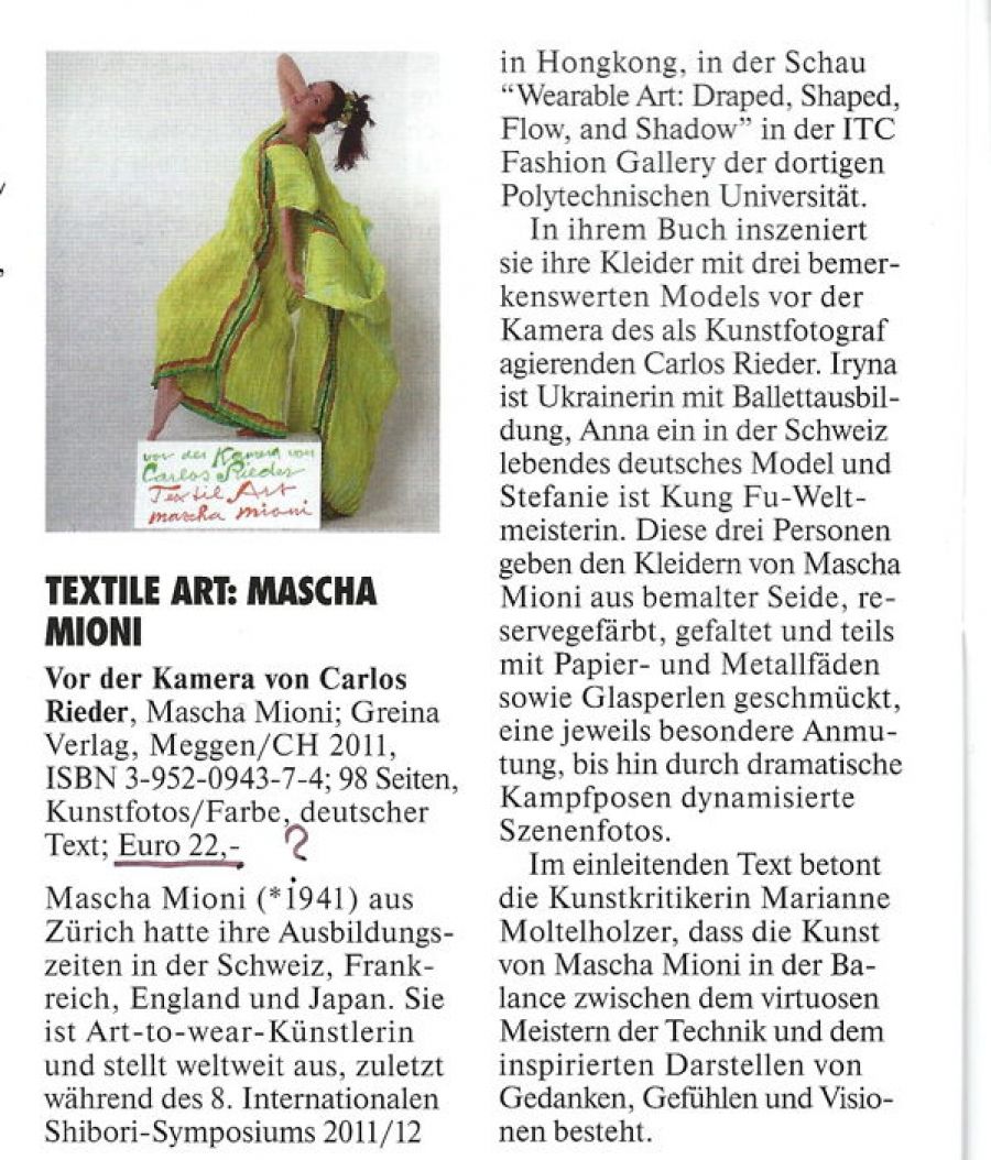 textile forum 2/2012 - Buchbesprechung "vor der Kamera von Carlos Rieder - Textile Art Mascha Mioni"