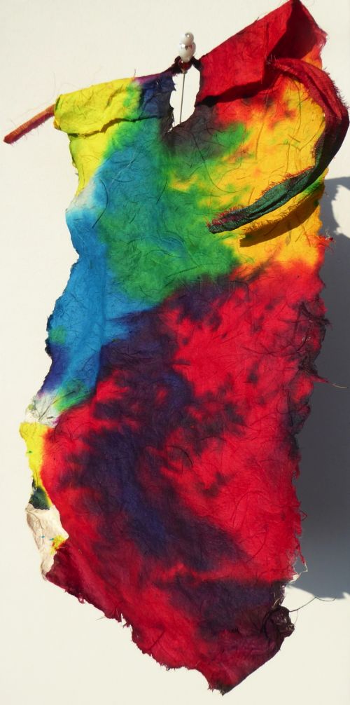 Farbe fliesst und verteilt sich auf handgschöpften Papier-Objekten. So entsteht ein zufälliges Muster: initiiert, aber nicht wirklich kontrolliert durch die Künstlerin. Erweitertes Shibori.