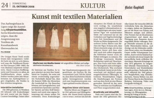 Pia Zeugin im Bieler Tagblatt Mascha Mioni .... verarbeitete eine negative Lebensssituation einer Angehörigen mit einer installativen Figur mit ausladendem Kleid. Auf Leinwand hat sie die Gedanken und Tagebucheinträge jener Zeit hinterlassen und die Stücke an Fäden festgemacht. Die anderen Enden führen zum Rücken der Figur. Es kann sein, dass Mioni einerseits zeigt, wie sie das Negative hinter sich liess oder aber auch sich selbst eingesteht, die Erlebnisse immer noch als Ballast mittragen zu müssen....