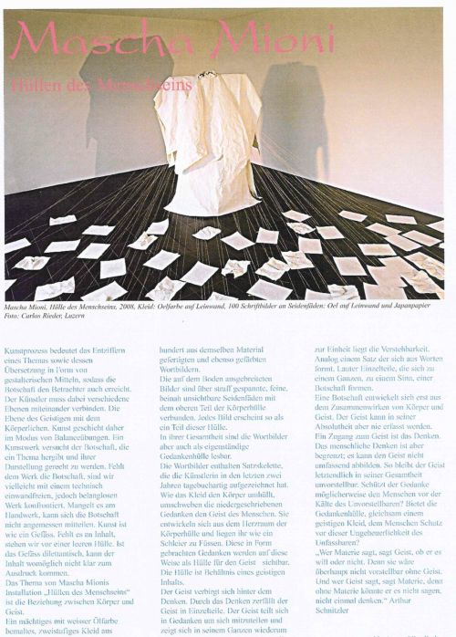 Die Kustritikerin Marianne Mittelholzer schreibt im Kunstmagazin futuro: ".... Das Thema von Mascha Mionis Installation "Hüllen des Menschseins" ist die Beziehung zwischen Körper und Geist. .... Wie das Kleid den Körper umhüllt, umschweben die niedergeschriebenen Gedanken den Geist des Menschen. ..... "
