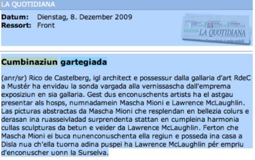 gallaria d'art RdeC, Disentis Meldung in "LA QUOTIDIANA" vom 8.12.2009 ...Las picturas abstractas da Mascha Mioni che resplendan en bellezia colurs e derasan ina ruasseivladad surprendenta stattan en cumpleina harmonia cullas sculpturas da betun e veider da Lawrence McLaughlin.....